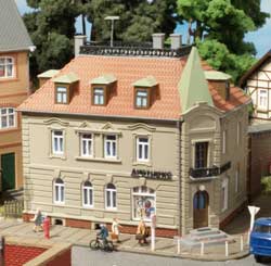 Die Bauzeichnung der Oschatzer Apotheke signierte der Architekt unter dem Datum Juni 1896. Detaillierte, gut strukturierte Fassade, interessante Dachgestaltung, Balkonanbau in Holzbauweise an der Rückfront. So ist das Modell geeignet, das Stadthäuser-Sortiment sinnvoll zu ergänzen. Auch als Eckhaus einsetzbar.
