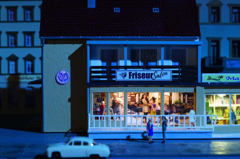 Bausatz. Die funktionsfähigen Leuchtreklamen von Auhagen sind in vielen Gebäude