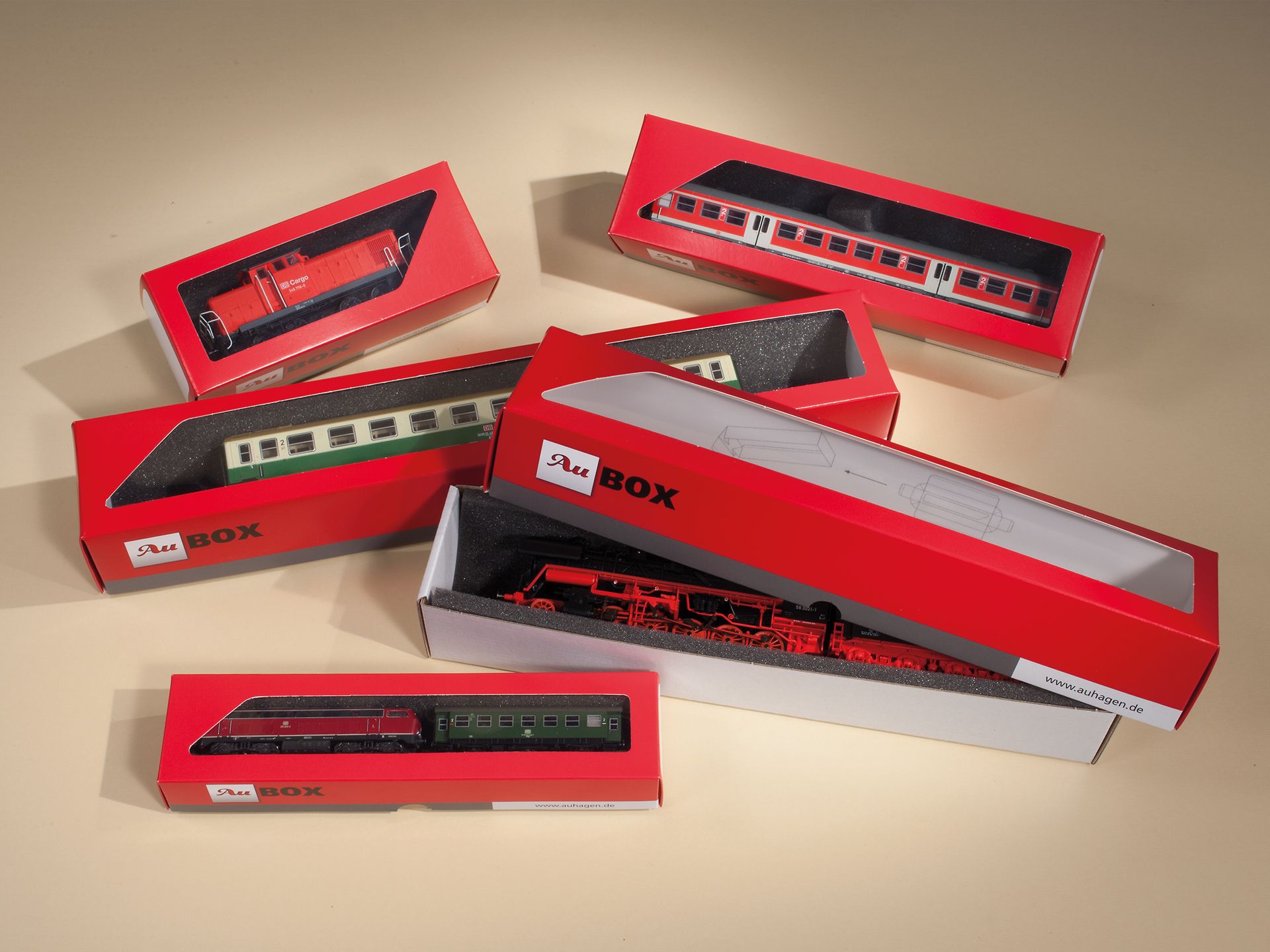 Lager- und Transportboxen für Loks und Wagen, denn mit der Zeit werden die Verpackungen Ihrer Schmuckstücke unansehnlich. Unsere attraktiven Schachteln schaffen Abhilfe. Deckel aus Karton mit Klarsichtfenster. Kasten aus stabiler Mikrowelle. Der Schaumstoffeinsatz schützt Ihre Fahrzeuge vor Beschädigungen. Die Faltschachteln sind leicht aufzustellen. Versand flachliegend. Diese Au-BOX ist besonders für maßstäbliche Reisezugwagen vorgesehen.