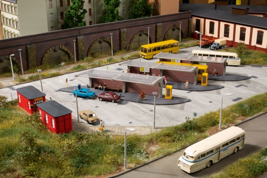 Das Modell passt durch seine moderne Gestaltung auch in heutige Modellbahn-Epochen. Mit dem Bausatz können drei Bahnsteige gebaut werden, zwei für Busse und einer für Taxis. Eine moderne Dachkonstruktion aus Glas bietet Regenschutz. Zwei kleine Gebäude sind als Fahrkartenverkauf mit Toilette sowie als Imbiss gestaltet. Für die Ausgestaltung liegen Papierkörbe, Bänke, Schilder und zwei Telefonzellen bei. Der Taxistand wird durch eine Rufsäule aus der Zeit der DDR ergänzt.