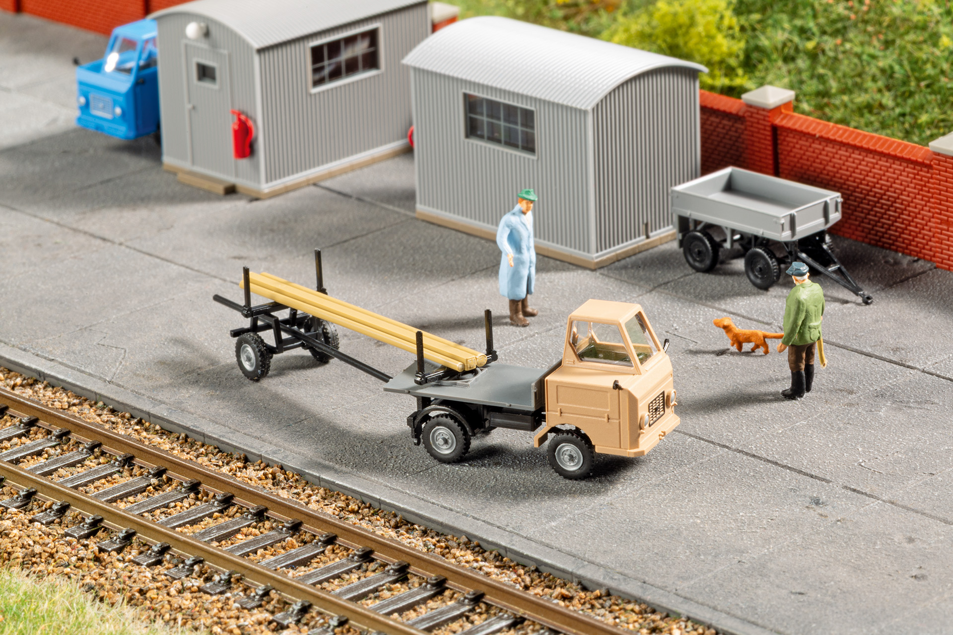 Bausatz. Zum sicheren Transport für lange Güter, in diesem Fall beiliegende Holzmasten, bietet sich ein gezogener Nachläufer ideal an. Hier ruht die Ladung sowohl auf dem Drehschemel des bekannten Multicar M22 Modells als auch zwischen den Rungen des mit einer verstellbaren Zugstange verbundenen Nachlaufanhängers.