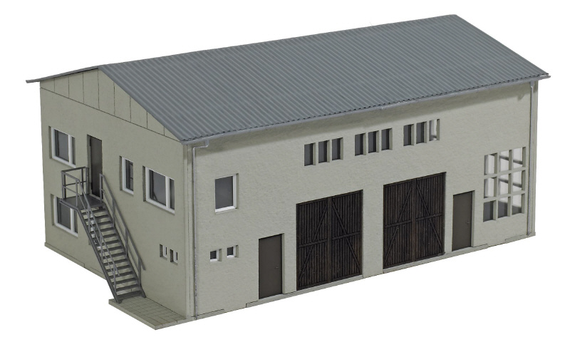 Werkstatt für die Wartung und Pflege der landwirtschaftlichen Fahrzeuge. Material und Ausstattung entsprechen dem Bausatz der LPG Stallung. Das Gebäude verfügt über zwei Stockwerke. Im unteren Bereich befindet sich die Wartungshalle mit den großen Schiebetoren und den großflächigen Werkstattfenstern, im Obergeschoss die Büroräume, die in der H0-Ausführung über eine Außentreppe zugänglich sind. Bausatz.