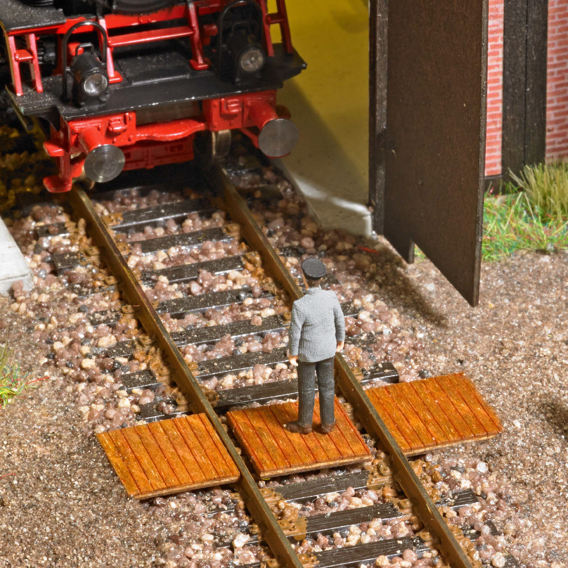 Für einen trittsicheren Fußgängerverkehr über die Gleise dienen diese Holzbohlen aus echtem Holz. Im Set sind drei verschiedene Bohlenbreiten für die Verlegung mehrerer Überwege enthalten.