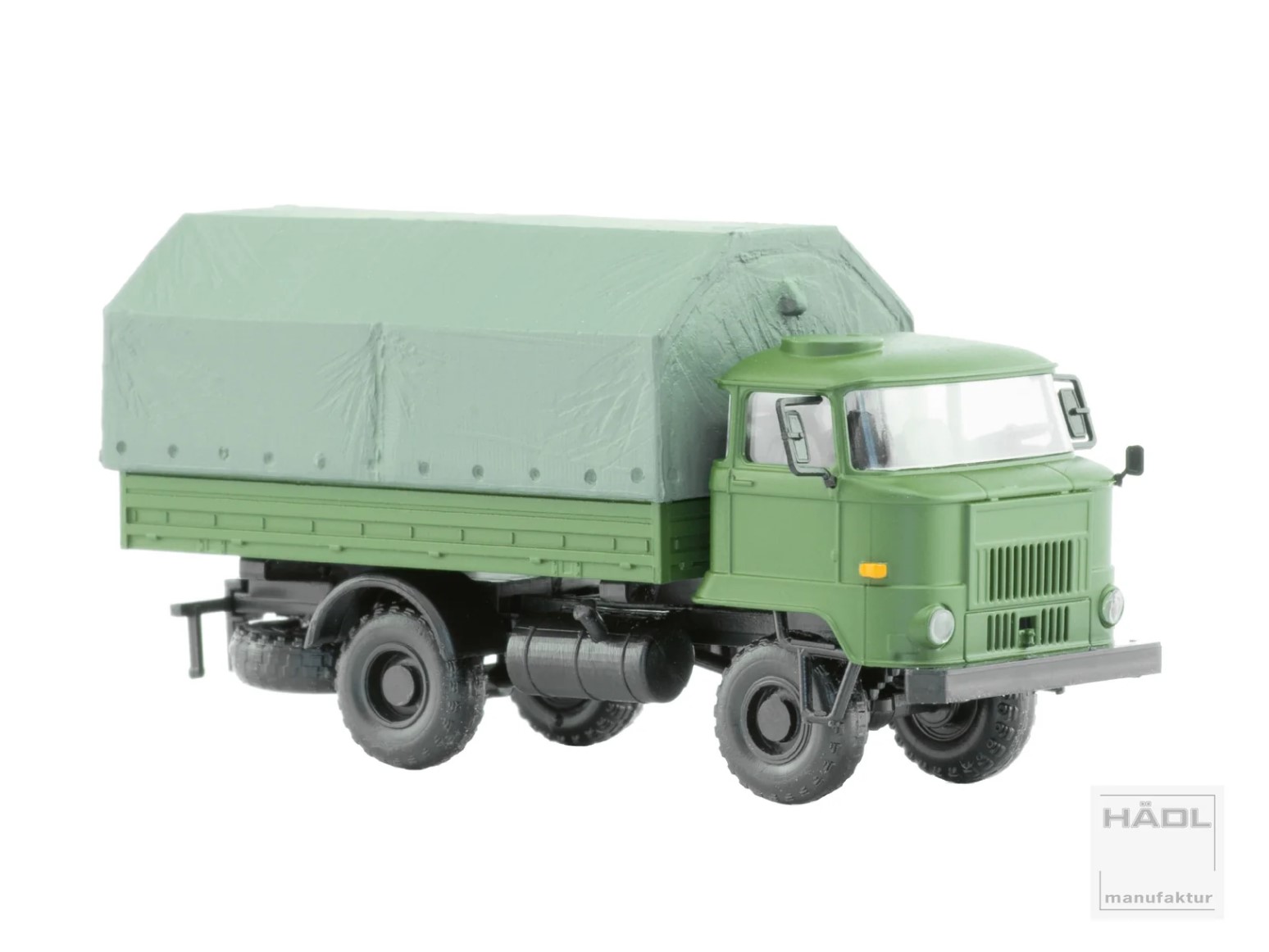 - einzeln eingesetzte Scheinwerfer - Kabine ist nur gesteckt, so dass man sie zur Platzierung von Fahrer und Beifahrer abnehmen kann - Plane hinten geschlossen - Zurüstteile wie verschiedene Spiegel, Zusatzscheinwerfer etc. beiliegend
