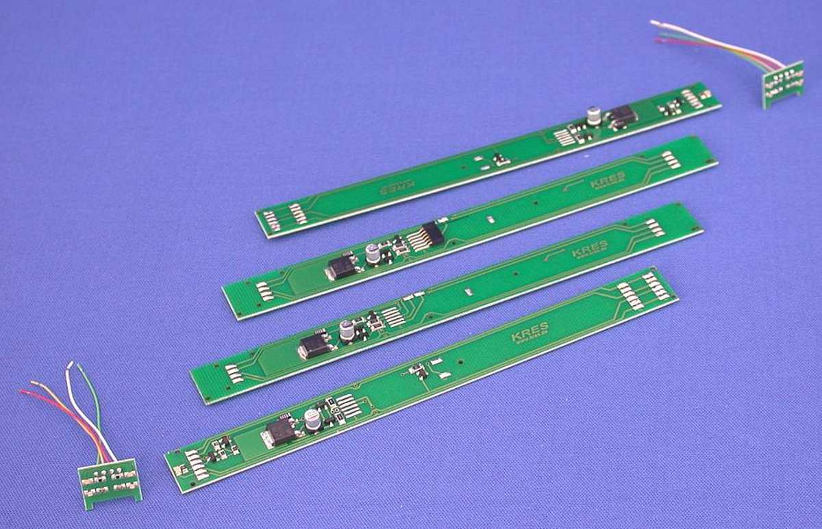 Das Set für die 4-teilige Grundeinheit enthält 4 Platinen für die Innenbeleuchtung der beiden VT, des VMc und des VMd sowie die Platinen für die Spitzenlichter. Diese digitale Ausführung enthält auch die FlexDec-Technologie.