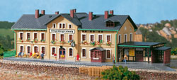Angebaute Gepäckabfertigung mit Fahrrad- bzw. Geräteschuppen, Vorhäuschen mit Eingang zur Restauration, Bahnsteig mit Auffahrt.