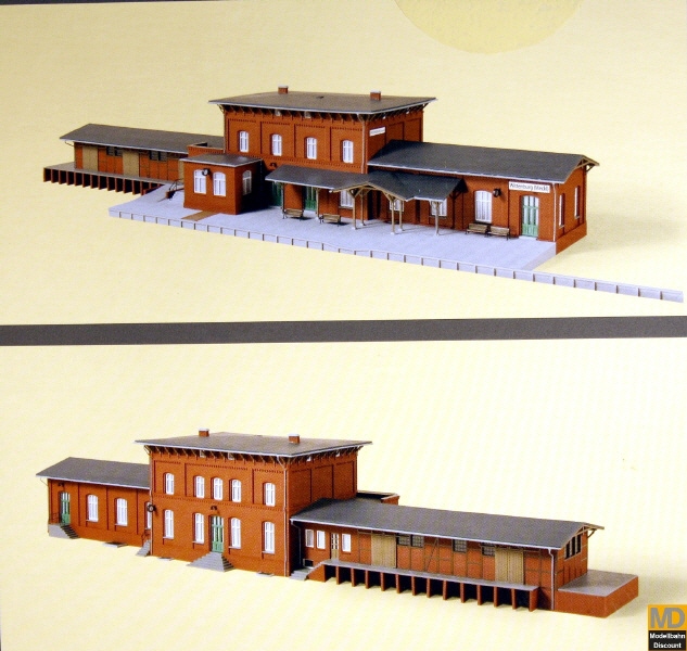 Das Vorbild dieses Modells steht in der Nähe von Schwerin an der Strecke Hagenow - Zarrentin. Durch den fast quadratischen Mittelbau mit der eigenwilligen Dachform wird das Gebäude sehr attraktiv.Mit Güterschuppen, Bahnsteig und Überdachung sowie Kellerlichtschacht, kleiner Rampe, Uhr, Lampe und Bänken.