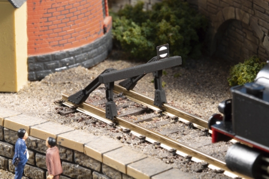 Filigranbausatz. Nachbildung eines Prellbocks aus mit Knotenblechen verschraubten Schienenprofilen. Zum Aufsetzen auf das Gleis. Die beiden fein detaillierten Modelle sind mit je einem Signal Sh0, Gleissperrsignaltafel, ausgestattet.