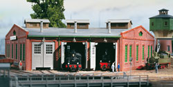 Mit 3 Lokständen für 15º Gleisteilung. Passend zur Fleischmann-Drehscheibe TT-6680. Erweiterung der Ringbauweise ist durch Ergänzungsteile Art. 14-13 281 möglich. Einfahrende Loks schließen und ausfahrende Loks öffnen die Tore. Oberlicht und 2 Rauchabzüge je Lokstand.