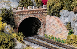 Meliert, mit 2 Flügelmauern und Mauerkrone. Für Dampf- und Oberleitungsbetrieb sowie Einbau im Gleisbogen. 132 x 105 mm ohne Flügelmauern Durchfahrthöhe 70 mm