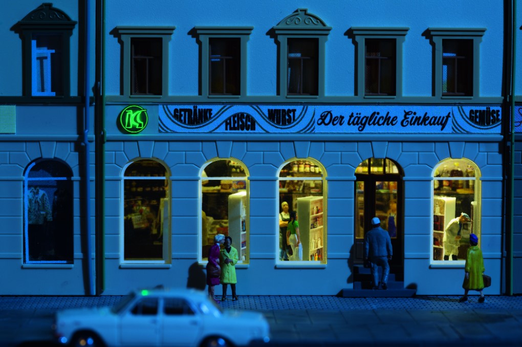 Bausatz. Die funktionsfähigen Leuchtreklamen von Auhagen sind in vielen Gebäude