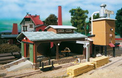 Dem Sägewerk in Pockau/Erzgebirge nachempfunden. Mit Gatterhalle, Späneturm mit manuell bedienbarem Schieber, Maschinenraum und Stamm-Material. 302 x 105 x 115 mm