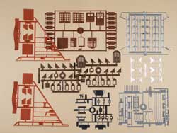 Firstziegelstreifen, Laufbretter, Schornsteine, Schornsteinköpfe, Dachgauben und Fenster für den Dachausbau, Antenne, kleine Dächer, Dachrinnen und Fallrohre.