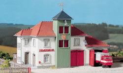 Die Freiwillige Feuerwehr Forchheim weihte 1927 ihr neues Spritzenhaus ein. Danach gestalteten wir ein allseitig interessantes Modell mit hölzernem Schlauchturm, Wohnung für den Brandmeister und großen Toren (Lichtes Maß 28 x 29 mm), die auch für neuere Fahrzeuge ausreichen. Anbau aus Holz für Leitern und Zubehör auf der Rückseite.