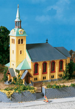 Liebevoll der Kirche des Erzgebirgsdorfes Börnichen nachgestaltet. Sie wurde 1900 gebaut und passt sehr gut zum Stadthäuserprogramm, aber ebenso gut in die Dorfmitte. Fein strukturierte Außenfassade, zusätzliche Eingänge zur Sakristei und Schallfenster im Glockenturm.
