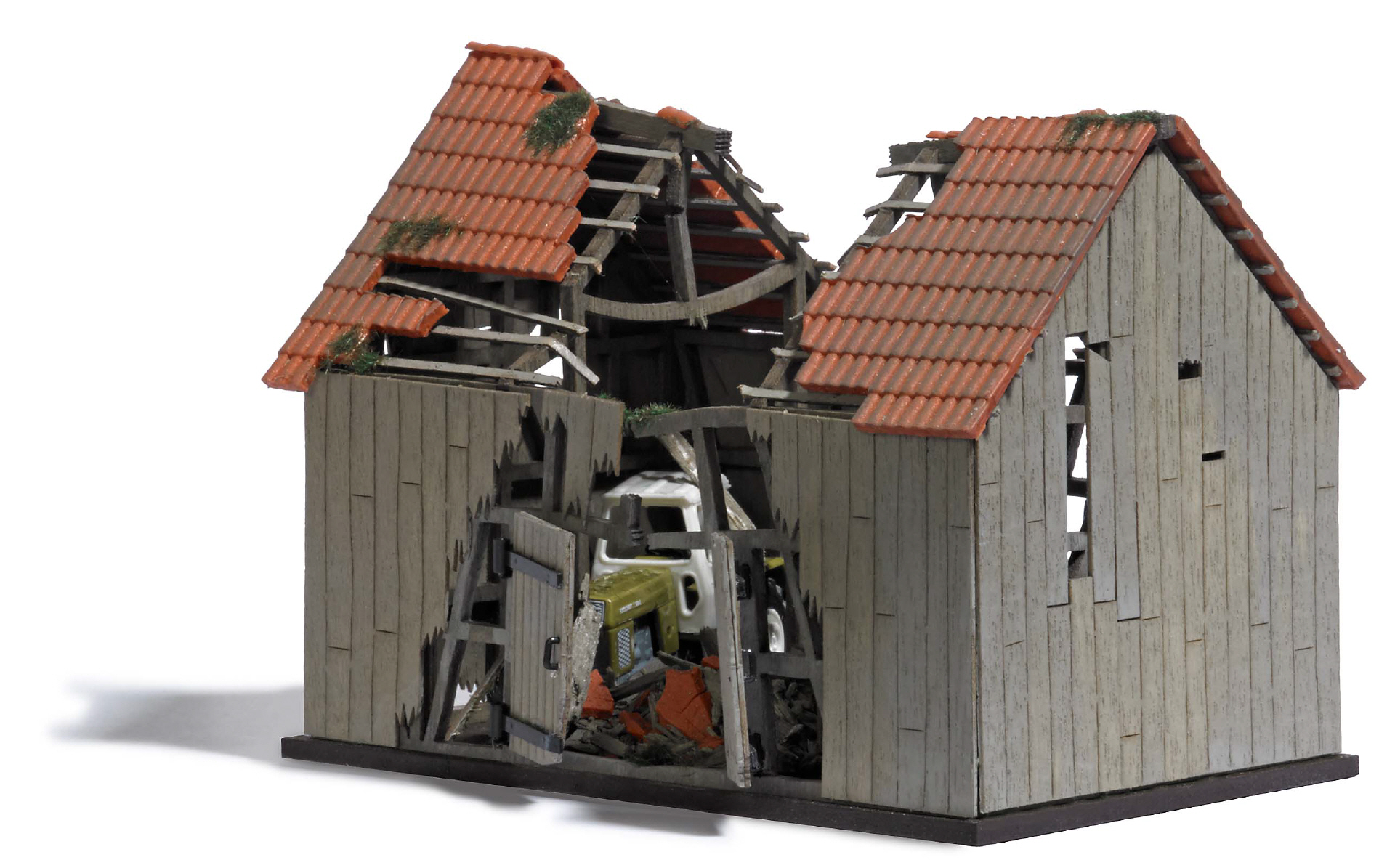 Der Zahn der Zeit hat seine Spuren an der alten Scheune deutlich hinterlassen. Echt-Holz-Bausatz mit