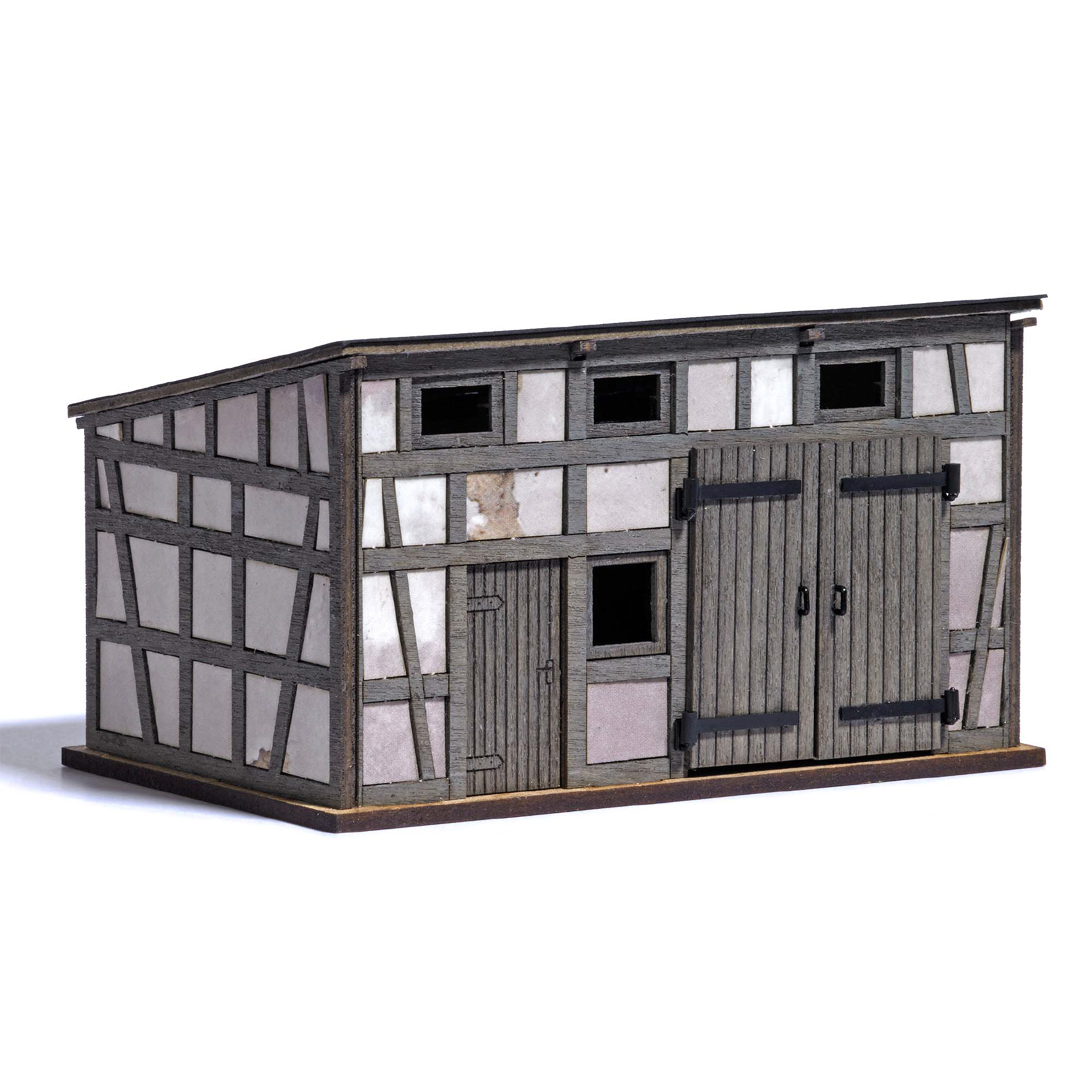 Die maroden Bauelemente dieses Hinterhofgebäudes wurden für den Lost-Places-Effekt speziell bearbeitet wie z.B. der abbröckelnde Putz in super-realistischer 3D-Optik. Fachwerk, Tür und Tor sind aus echtem Holz. Alle Teile fertig koloriert. Universell einsetzbar z.B. als Werkstatt, Garage, Wäscherei, für Bahnbetriebswerke, Bekohlungsanlagen u.v.m.