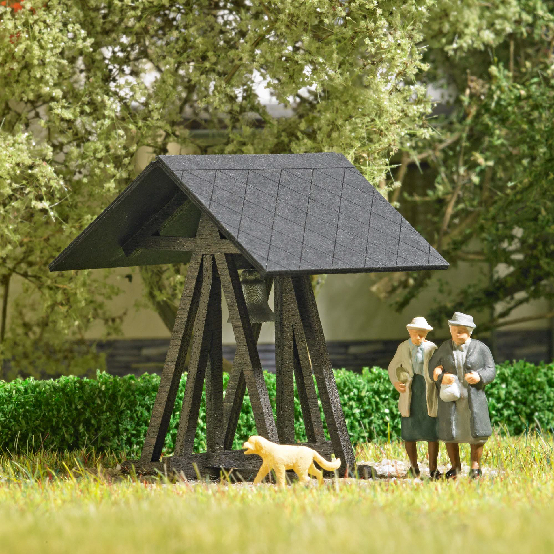 Bausatz aus echtem Holz für einen freistehenden Glockenstuhl mit Glocke. Das Originalvorbild steht am Eingang der Gedenkstätte Kapelle Peenemünde auf der Insel Usedom.