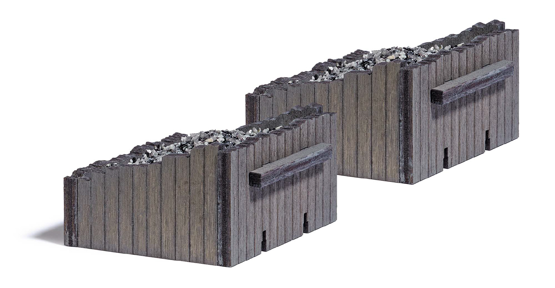 Bausatz für 2 Prellböcke aus echtem Holz, bereits fertig koloriert. Integrierter Schotterkasten mit Füllung. Passend für TT-Gleise ohne Bettung. Größe jeweils 32 x 28 mm, Höhe: 18 mm.