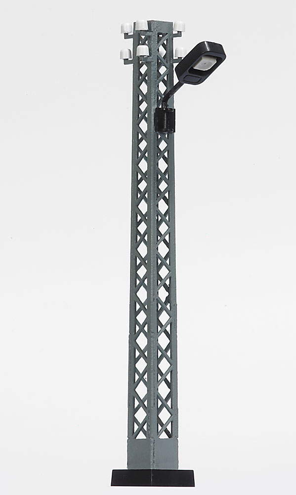 Realistische Nachbildung des weißen Lichtes, das im Original durch Quecksilberdampflampen erzeugt wird, durch weiße Neon-LED. Der Gittermast kann mit weiteren Leuchtkörpern aus dem Set H0 26-4152 bestückt werden. Fertigmodell. Höhe: 78 mm.
