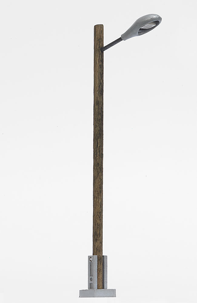 Universell einsetzbare Straßenleuchte mit Mast aus echtem Holz. Auch für den Bahnhofsbereich und Industriegelände geeignet. Nachbildung der Betoneinfassung am Fuß der Lampe.