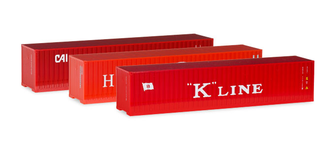 Die von Herpa entwickelten 40 ft. Boxcontainer in der Baugröße 1:120 / Spur TT eignen sich ideal für Zugbeladungen. Die drei namhaften Reedereien Hamburg Süd, K-Line und CAI stellen die Vorbilder für dieses Zubehörset.
