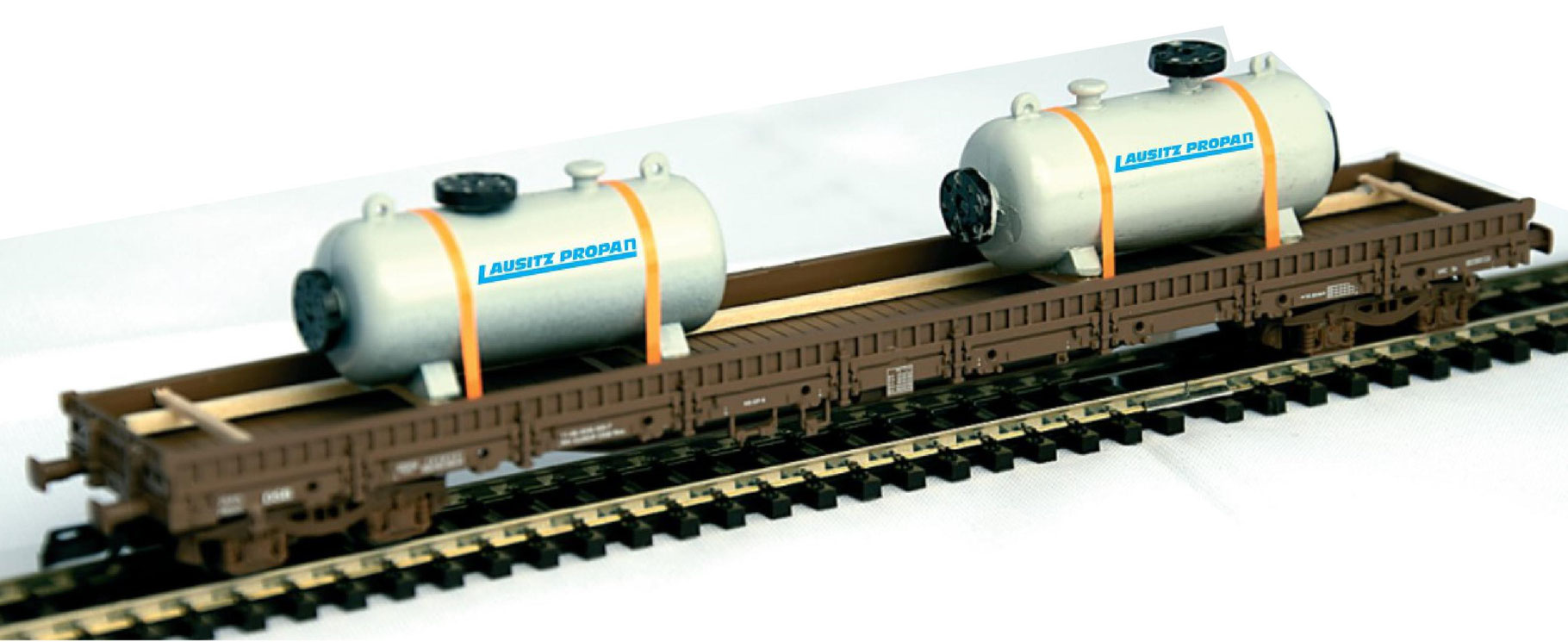 Beidseitig aufwändig und vorbildgetreu bedruckt, auf Transportgestell gelagert und mit Spannbändern gesichert; passend für alle gängigen 4-achsigen Flach-, Niederbord- und Rungenwagen