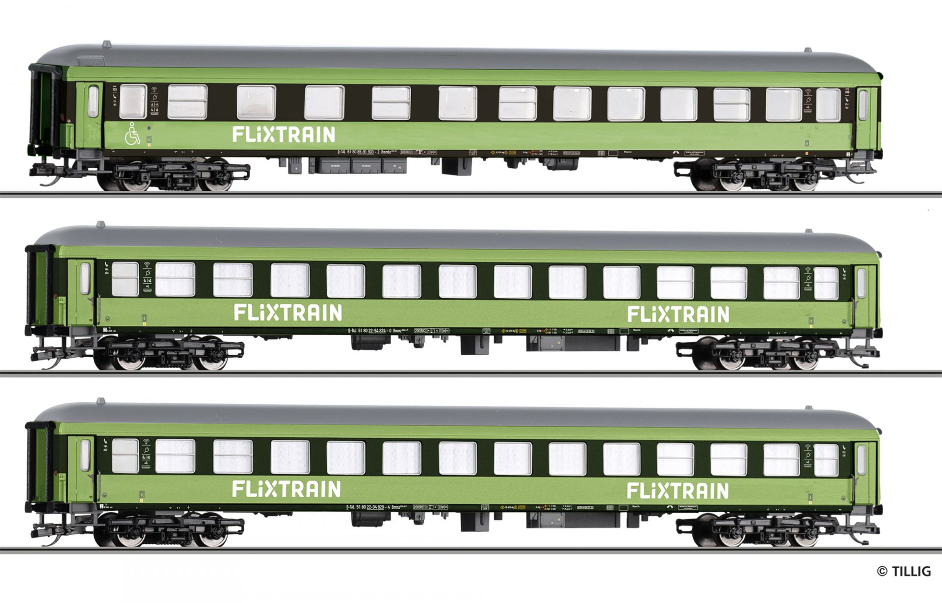 Reisezugwagenset „Flixtrain“, Teil 1, bestehend aus zwei Reisezugwagen Bmmz 264.4 und einem Bmmbz 266.9