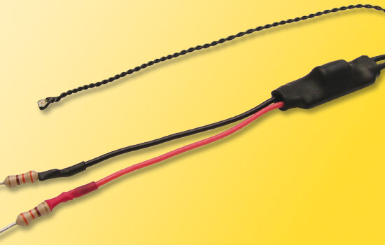 Dieser Effekt simuliert das Funkenschlagen am Pantographen einer fahrenden E-Lok. Er besteht aus einer sehr kleinen Elektronik und einer blauen Micro-Leuchtdiode. Zum einfachen Einbau in E-Loks der Baugröße H0, TT und N.
