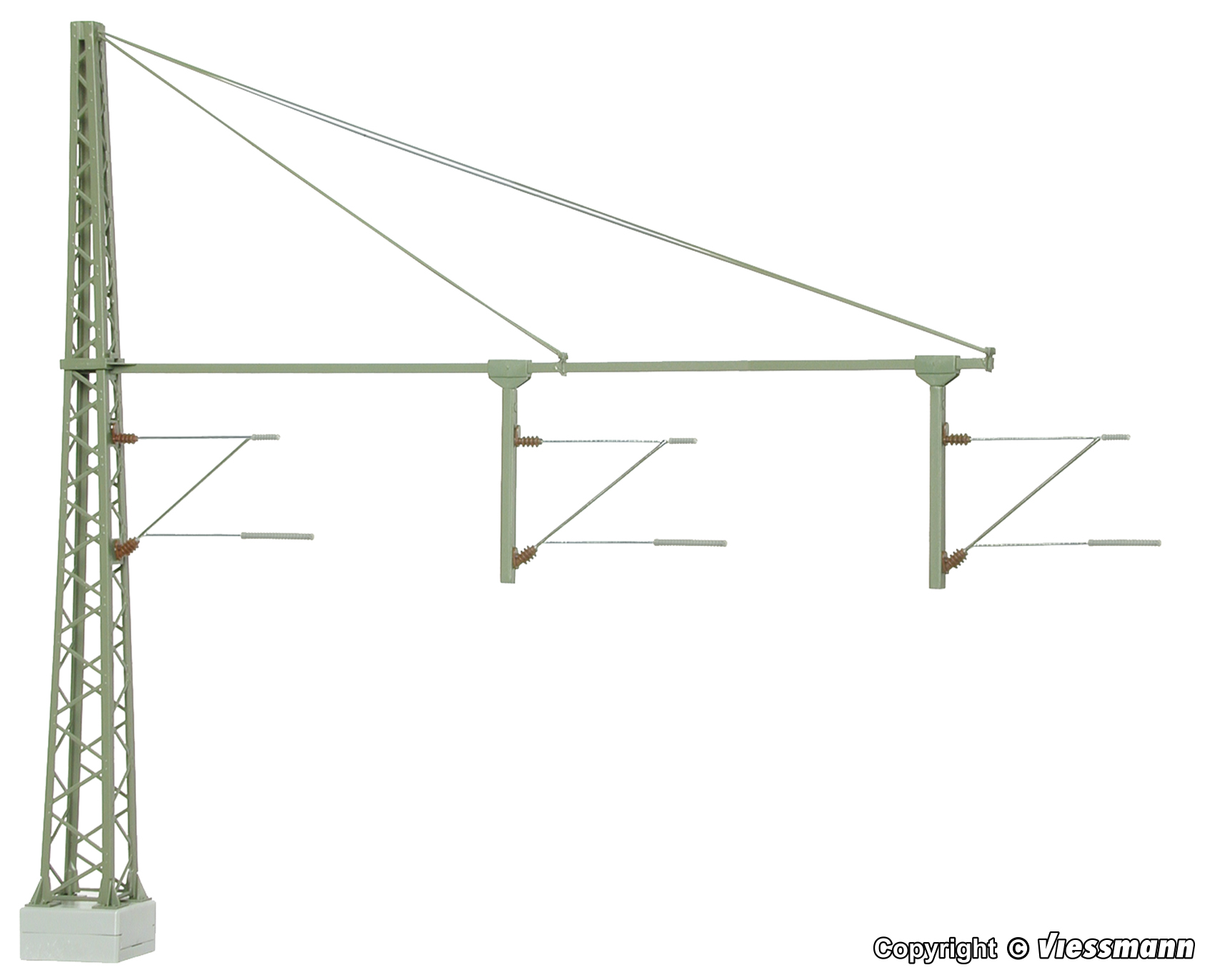 Komplett mit Turmmast, fertig montiert und lackiert. Mit 3 elektrisch getrennten Auslegern. Die Auslegereinheiten sind frei verschiebbar und umklipsbar. Filigrane Metallausführung mit eingeprägten Nietenimitationen. Maximale Spannweite: 11,7 cm, Höhe: 12,4 cm.